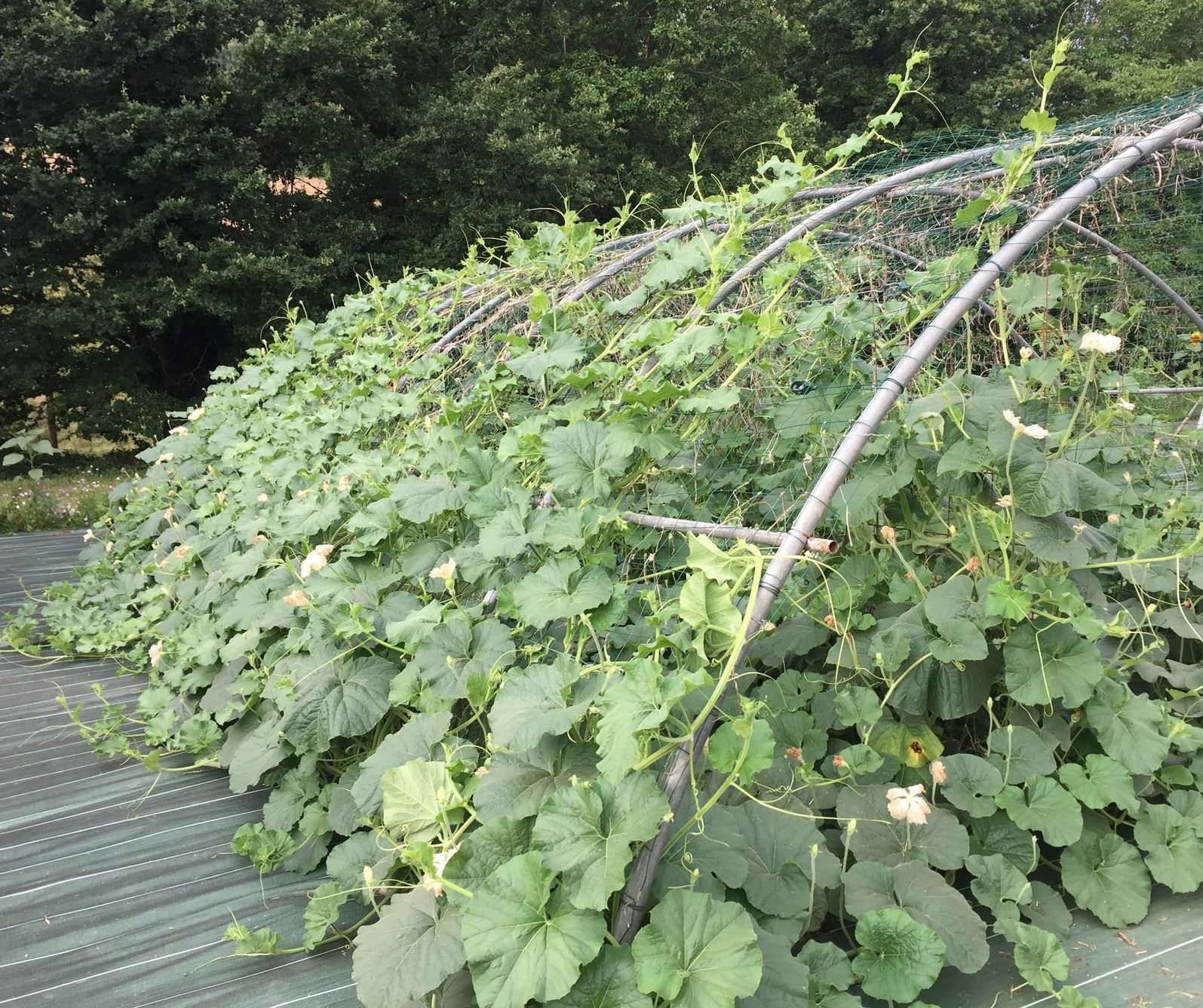Cette technique permet à cette plante très coureuse de s’accrocher et de produire des fruits qui ne se déforment pas au contact du sol.